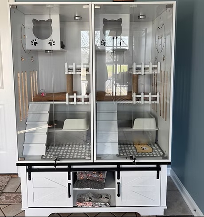 Cats stay in a separate luxury villa away from dogs. The space offers privacy and comfort. Cats enjoy scheduled free play and lounge time on a rotation basis.