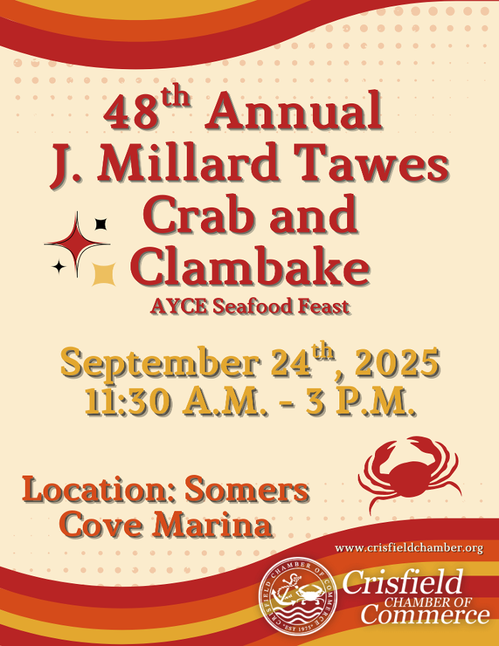 Crisfield, MD - The Crisfield Chamber of Commerce has announced the 48th Annual J. Millard Tawes Crab and Clam Bake. The event will take place on Wednesday, September 24, 2025, from 11:30 AM to 3:00 PM at Somers Cove Marina, located at 715 Broadway Avenue.