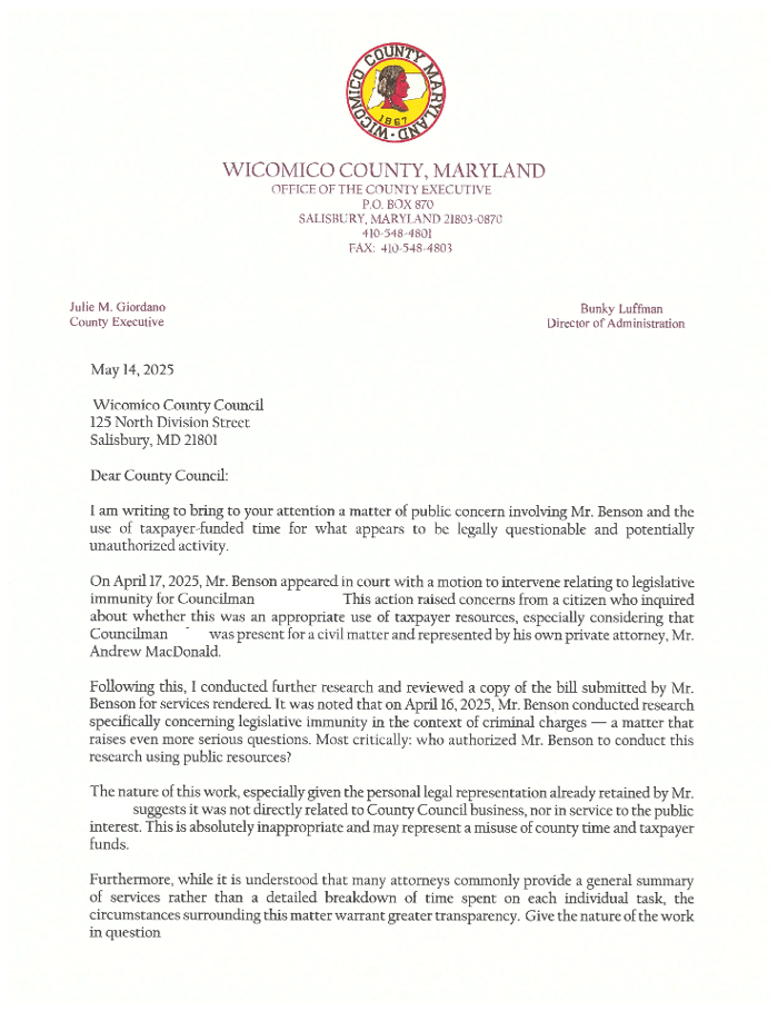 During this meeting, Mr. Benson publicly responded to a letter from Wicomico County Executive Julie Giordano. Giordano's letter sparked discussions as it criticized certain council members, including Mr. Benson, raising concerns about the use of taxpayer-funded time for activities deemed "legally questionable and potentially unauthorized activity."