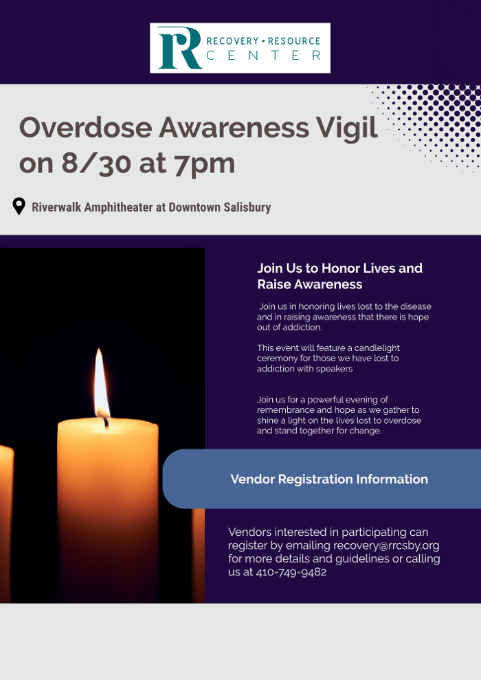 Salisbury, MD - The Recovery Resource Center will host the annual Overdose Awareness Vigil on Friday, August 30, 2025, at the Amphitheater at the Salisbury Riverwalk. The event, which begins at 7:00 PM, is free and open to the public.