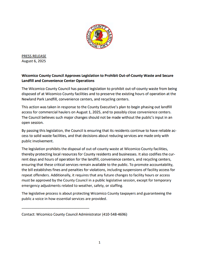 Wicomico County, MD - The Wicomico County Council has enacted new legislation regarding landfill operations during its Monday night meeting. The legislation includes a critical provision that prohibits out-of-county trash from being accepted at the county landfill, a move praised as a significant win for local residents.