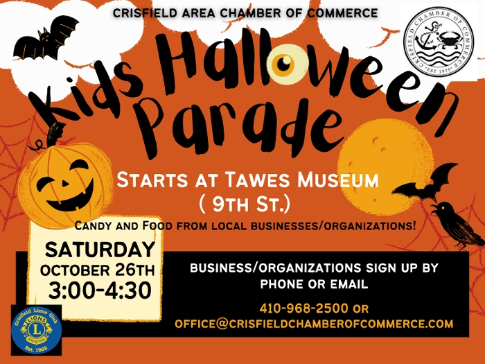 Get your little goblins and ghouls ready for the Annual Kids Halloween Parade in Crisfield on October 26th, 2024, from 3:00 PM - 4:30 PM!