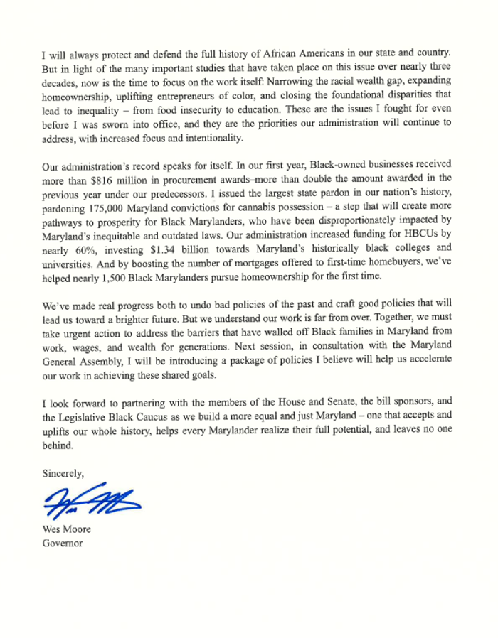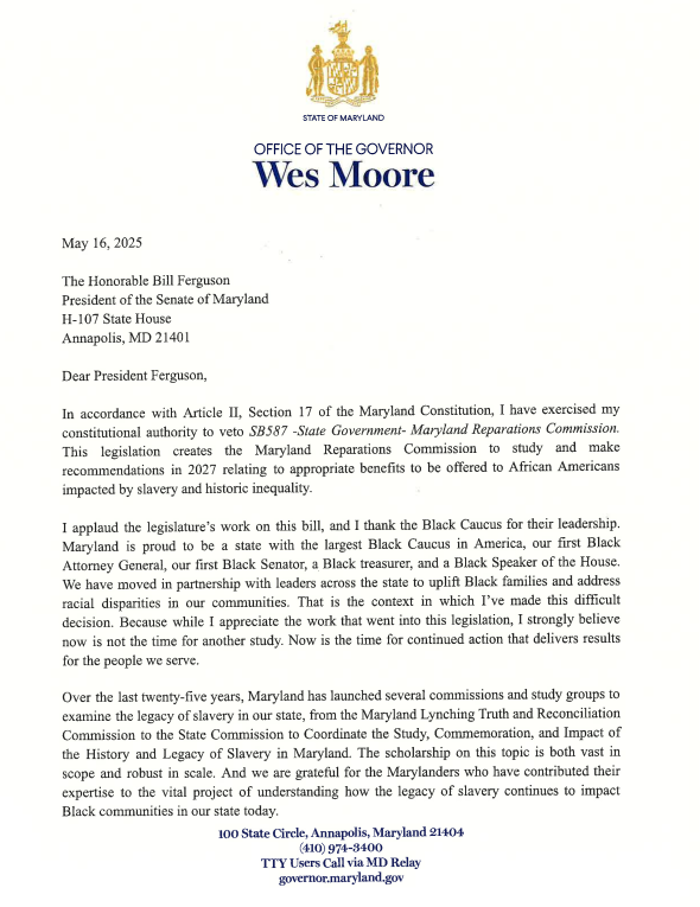 MARYLAND GOVERNOR WES MOORE VETOES REPARATIONS STUDY BILL