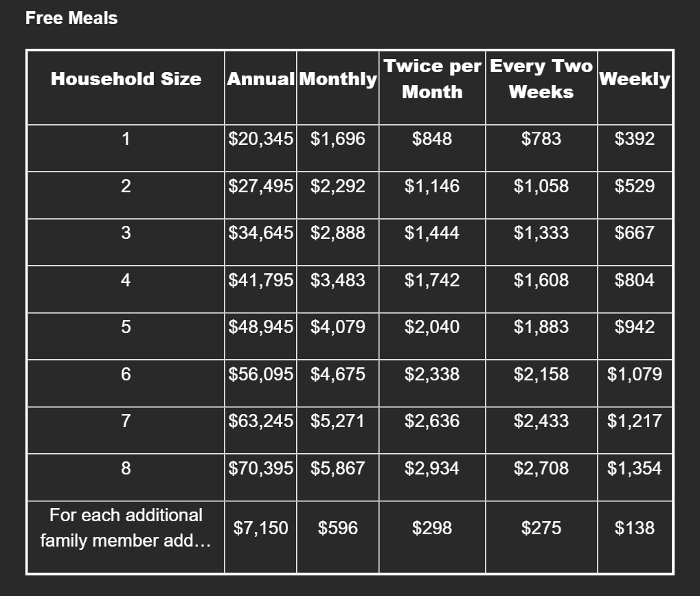 Eligibility for school meal assistance is determined by household size and annual income. Under the updated guidelines, a family of four with an annual income at or below $41,795 qualifies for free school meals.