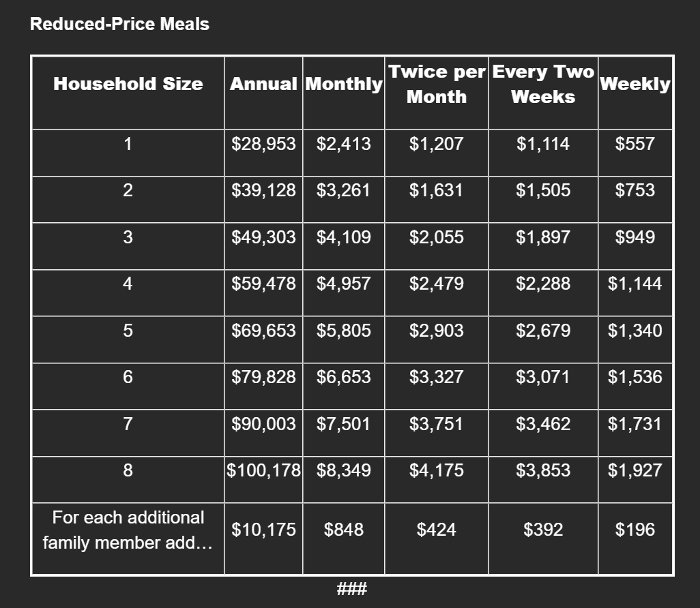 Families earning between $41,796 and $59,478 annually are eligible for reduced-price meals.