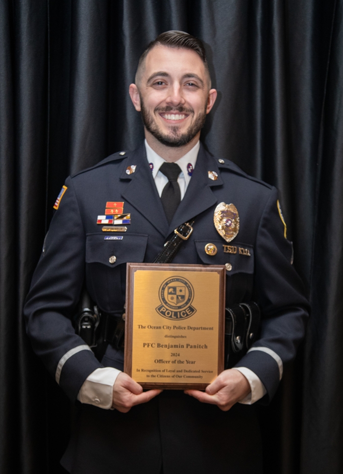 PFC Benjamin Panitch began his service to the Ocean City community in 2019 as a 911 dispatcher before transitioning to a full-time officer a year later. Since then, he has been an integral part of the Traffic Safety Unit.