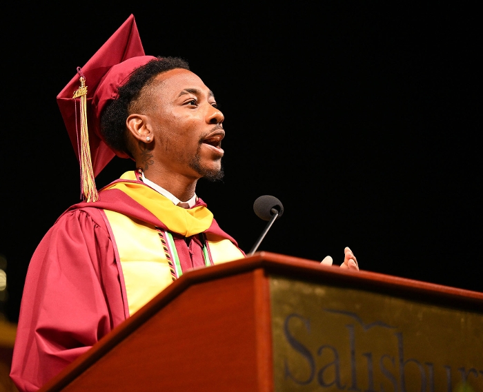 Quentin Parker of Bowie, MD, who earned his B.A. in English, served as the Thursday morning student speaker at the ceremony honoring graduates from the Charles R. and Martha N. Fulton School of Liberal Arts, and Franklin P. Perdue School of Business.