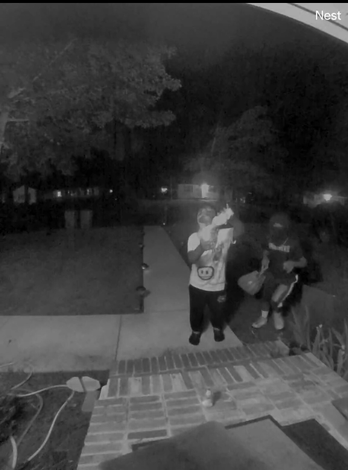The suspects are believed to be two black males. One wears dark pants and a white shirt with a horse or cow printed on the front, and the other wears dark pants and a Fortnite shirt.