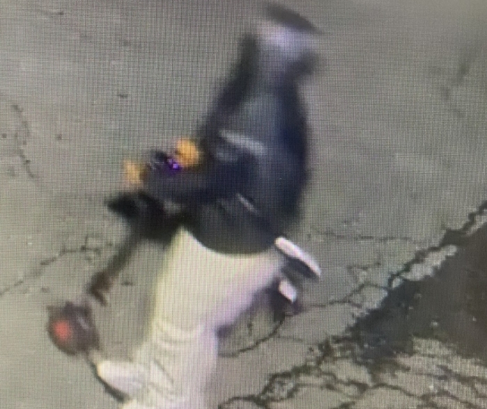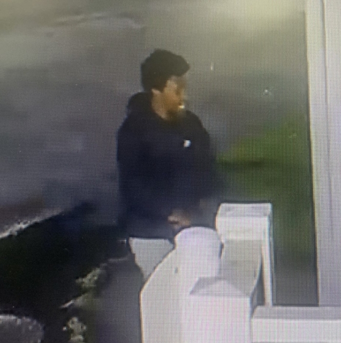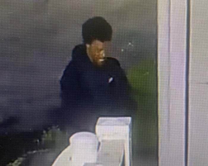 The suspect was last seen wearing a black hoodie, gray pants, and white shoes. A photograph of the individual is provided for identification purposes.