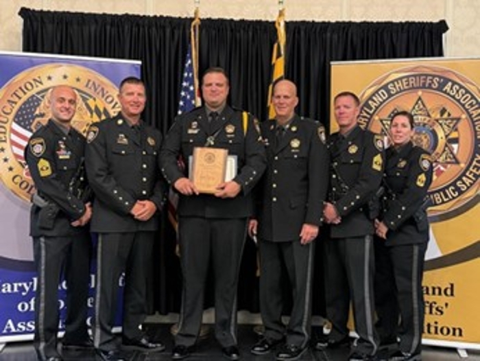 DFC Derek Scrivener of the Talbot County Sheriff's Office Patrol Division received the Maryland Sheriffs' Association Deputy of the Year Award for Traffic Safety (Small Agency). Sheriff Joe Gamble and members of the Sheriff's Office Command Staff attended the recognition ceremony.