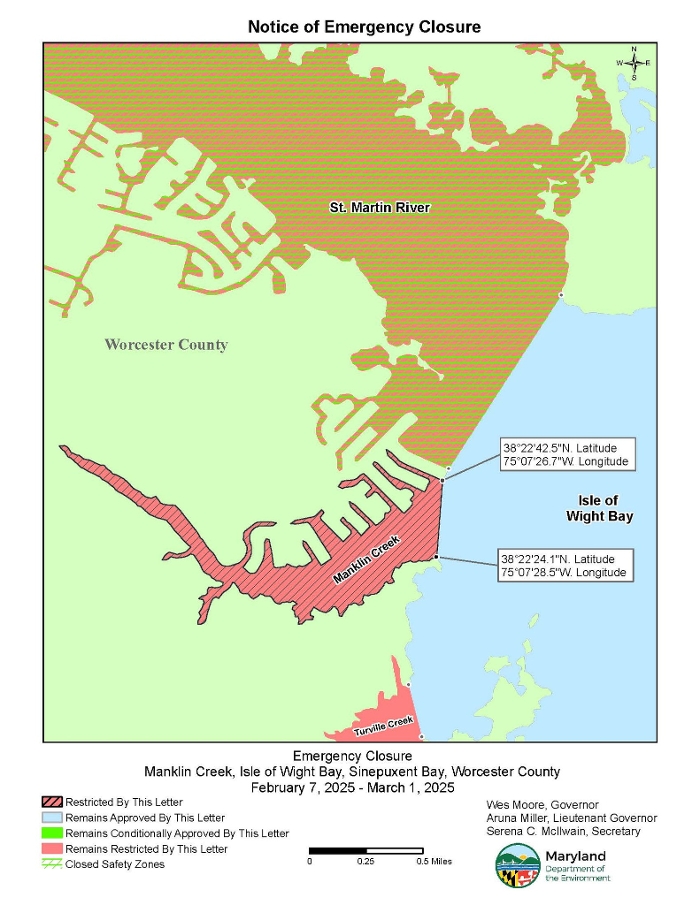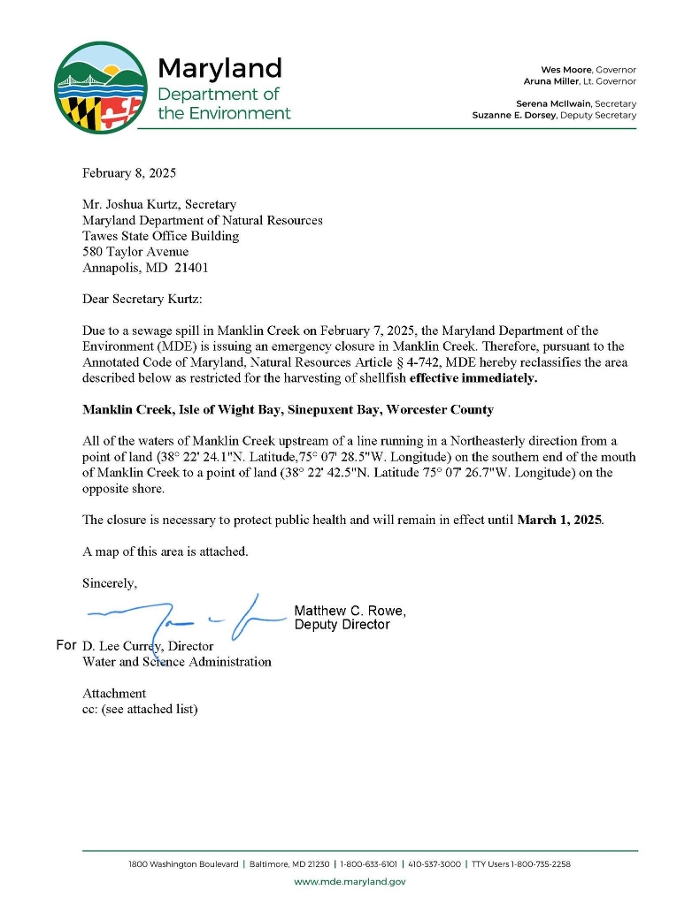 Following this, MDE put out a public notice putting a temporary hold on shellfish harvesting in Manklin Creek, as confirmed by Public Works Director Dallas Baker.